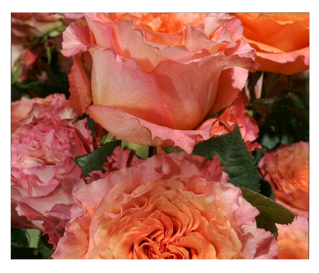 Róża, która wygląda jak namalowana akwarelą. Jej ogromne, pełne kwiaty mienią się odcieniami brzoskwini, moreli, różu i koralu, każdy kwiat jest inny, każdy wyjątkowy.